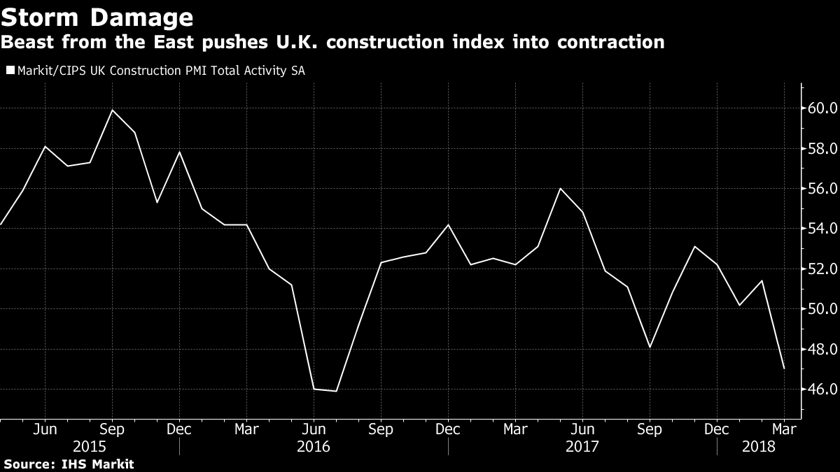 “U.K. Construction, Hit by March Snow, Shrinks Most Since 2016. Civil engineering activity fell the most in five years, commercial activity declined, and house building increased slightly. But in a sign the slump may be short lived, business expectations and hiring both picked up, Markit said”.