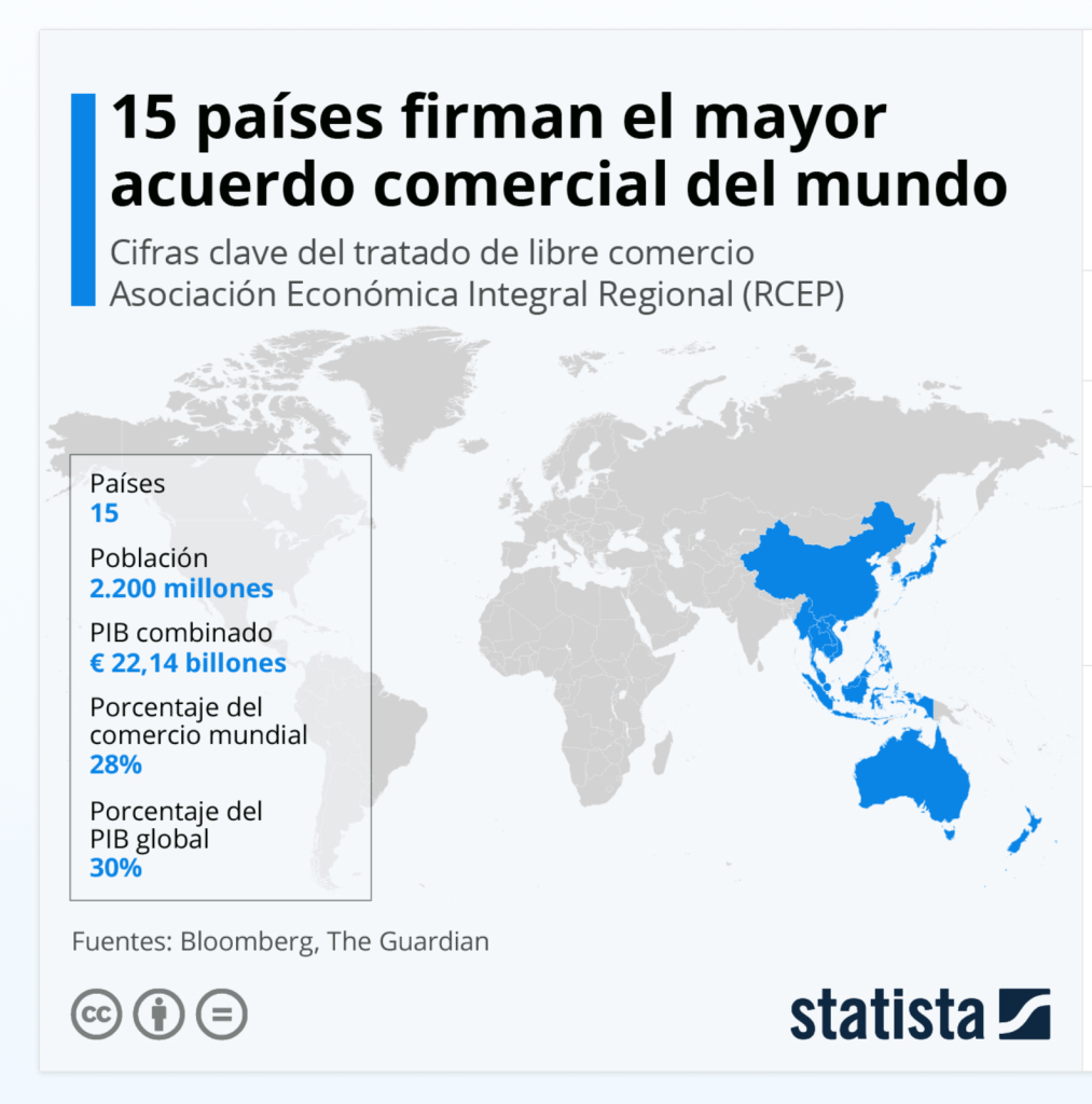 Los mandatarios de una quincena de países de Asia-Pacífico han firmado el pasado mes de noviembre la creación de la Asociación Económica Integral Regional (RCEP), el mayor tratado de libre comercio del mundo.
