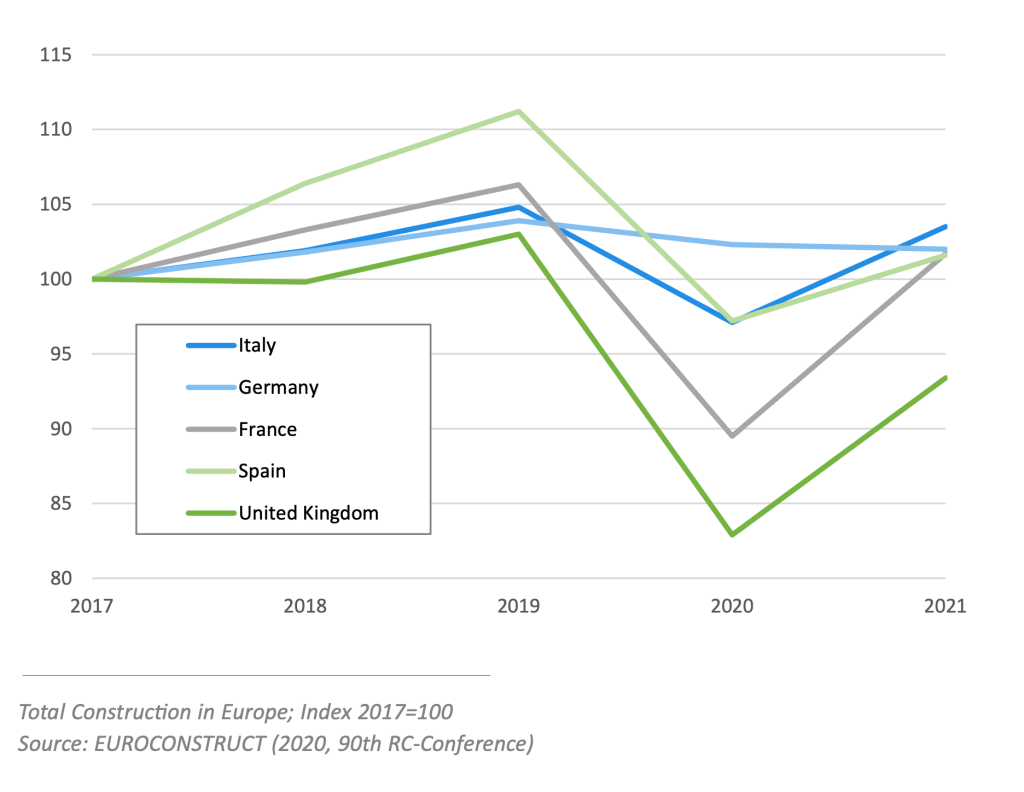 - The impact of the pandemic on the construction sector is expected to persist during 2021. Finally, the impact of Covid’19 can clearly be seen on the construction market in Italy. In April 2020, output fell by 51.5% on a month-on-month basis, following a sig- nificant fall of 36.4% reported in March. In the three months to April 2020, the index for construction output showed a decline of 33.2% compared with the previous three months, and year-on-year the index plummeted by 66.7%. Since the summer, construction activity has partially recovered, but has not been strong enough to compensate for the losses incurred earlier in the year. Over the first eleven months of 2020, the index for construction output showed a fall of 8.6%.